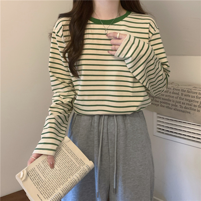 シンプルで着回しやすいボーダー柄ロングスリーブトップス